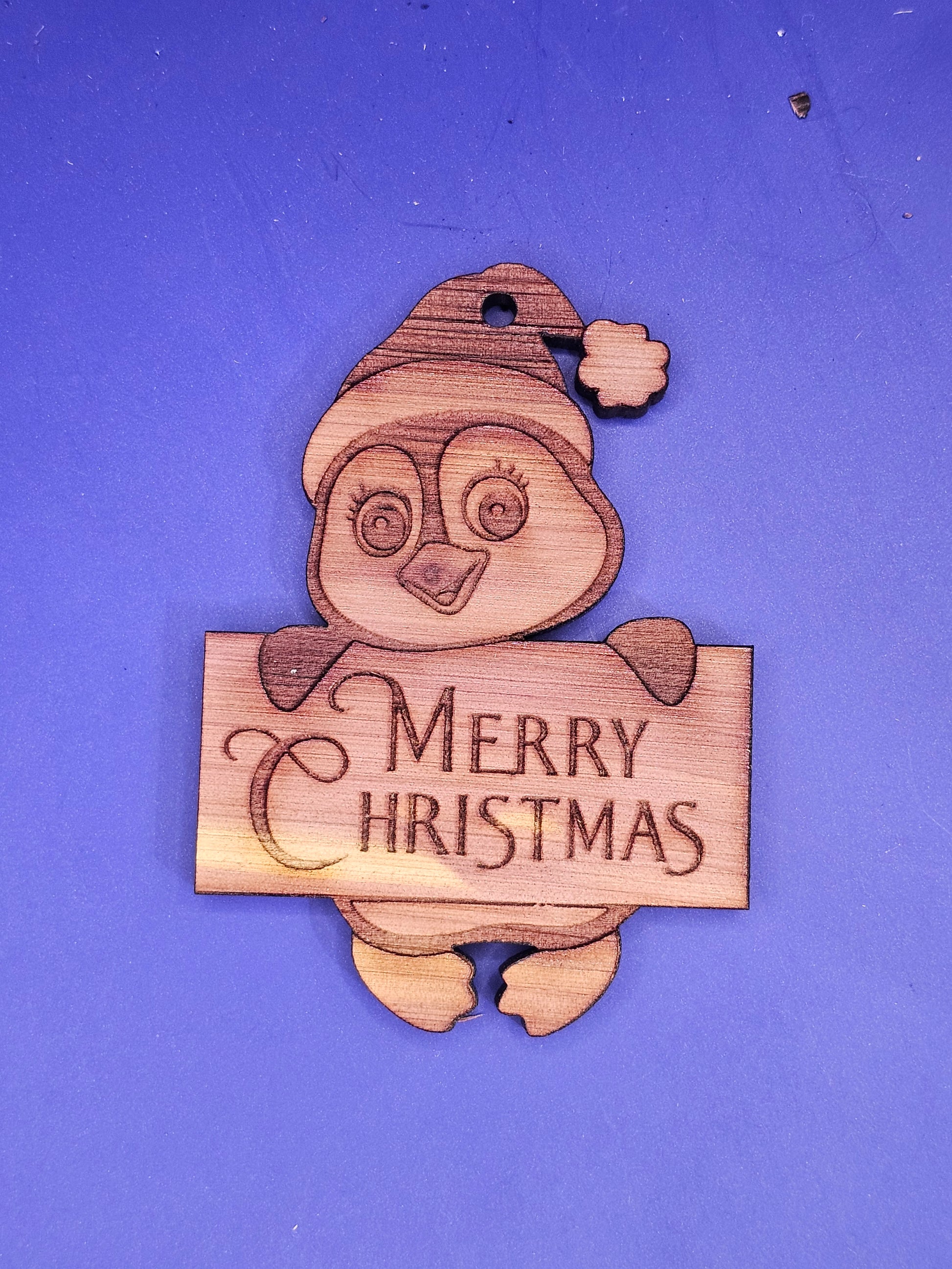 Penguin Merry Christmas Cedar Ornament